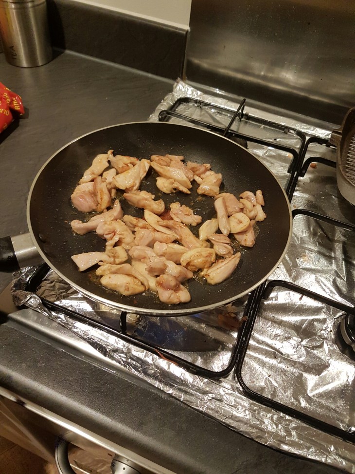 Firstly chop your chicken thigh into small slices and fry in the pan until it’s just starting to brown