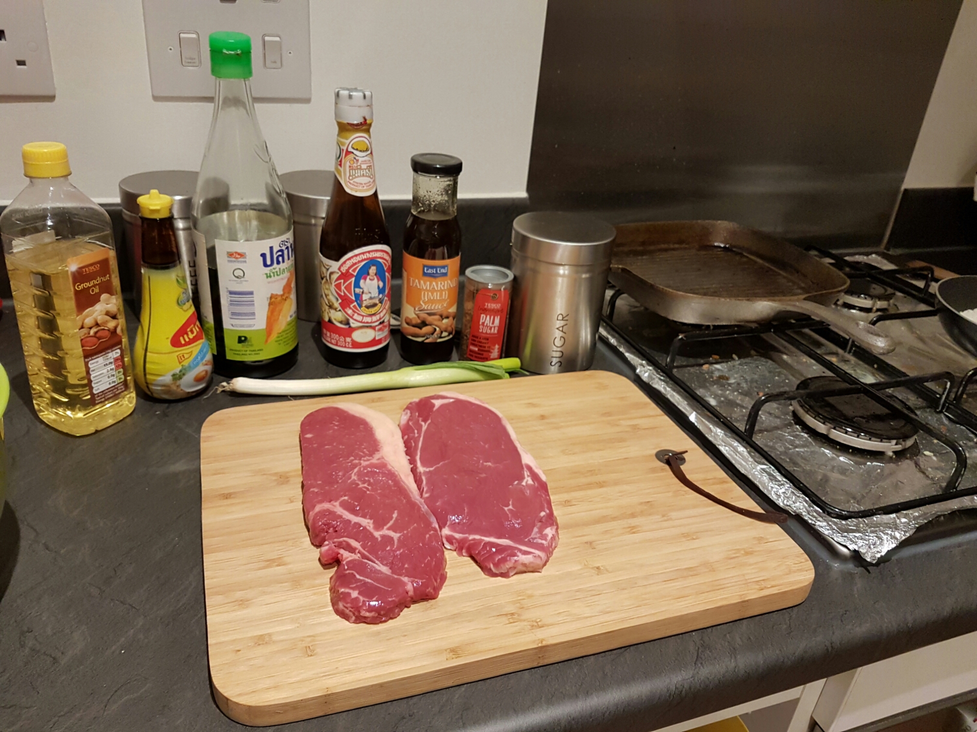 In the mixing bowl combine the Granulated sugar 1tsp , oyster sauce 1tbsp and fish sauce 1tbsp, give it a little stir then add 2 tbsp groundnut oil and 1tbsp of seasoning sauce, stir to disolve. then add in the 2 sirlion steak and roll them in the sauce and leave to marinade for 1 hour at room tempreture.
