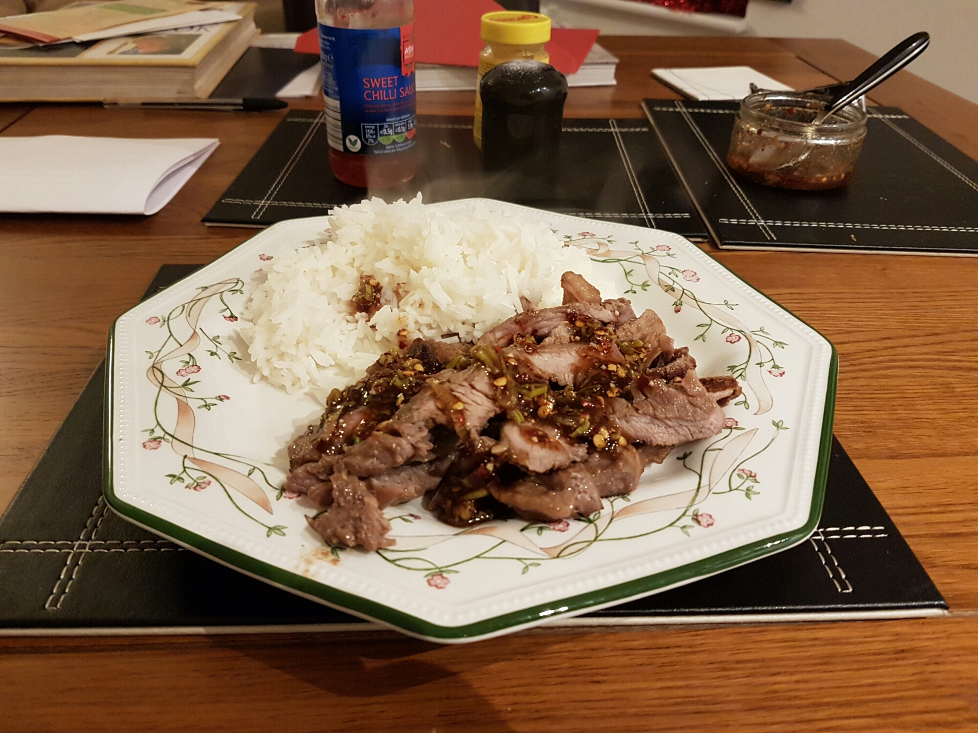 Cook the jasmine rice according to the packet instructions about 10 mins before the Hour is up on the steak, to give you about 20 mins cooking and rest time.Keep it in the pot to keep warm.