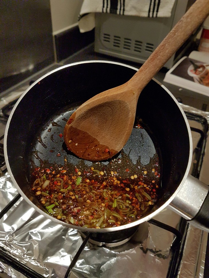 In the mean time to make the sauce cook 2tbsp of tamarind sauce 1 tsp of palm sugar 1 tbsp fish sauce 1 tbsp of chilli flakes on a low heat. when the mixture starts to boil take it off the heat and add in a chopped spring onion. You can add a tsp of toasted rice at this stage. if you want to make toasted rice just put a little in a frying pan until it browns.